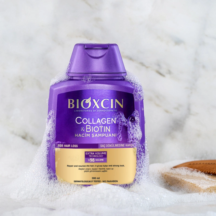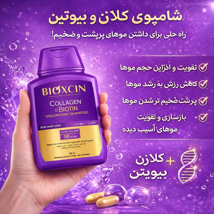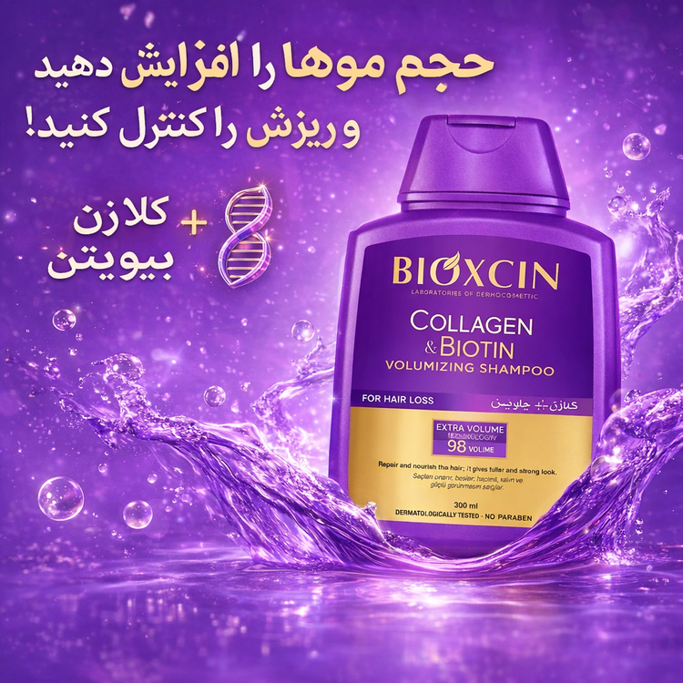 بیوکسین بنفش یه شامپو با خواص دارویی که تاثیر بسزایی در افزایش حجم مو دارد و موهای آسیب دیده را در صورت استفاده مداوم کاملا ترمیم میکند، چون کلاژن سازی میکند و تاثیر عمقی بر ریشه مو دارد این باعث میشود از ریزش موها جلوگیری کند.